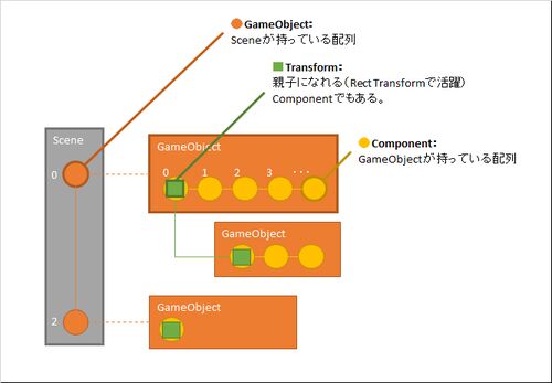 Unity学習#14では、リストの要素数でサイズが変わるリストの作成手順について書きました。この記事は、その前段として、リストの各階層にアクセスするために必要な GameObject、Component、Transform の関係性についてまとめます。先に結論を書き、その後で…