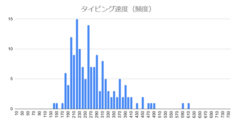 いろいろ調べてみると、タイピング速度は正規分布でなく対数正規分布またはべき乗分布に近そう。