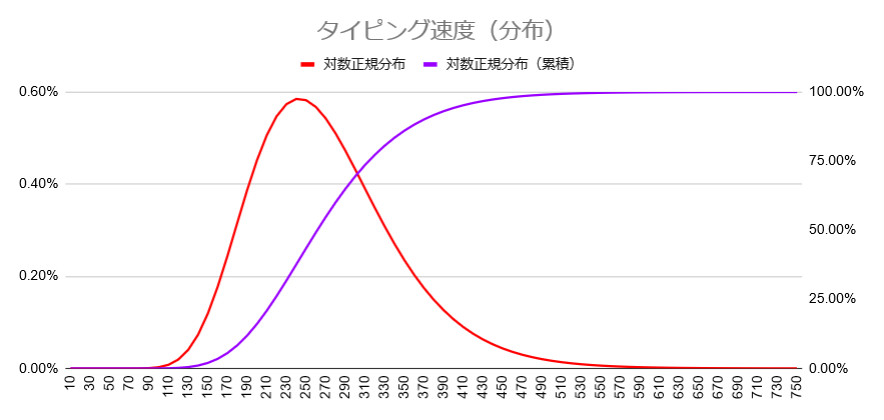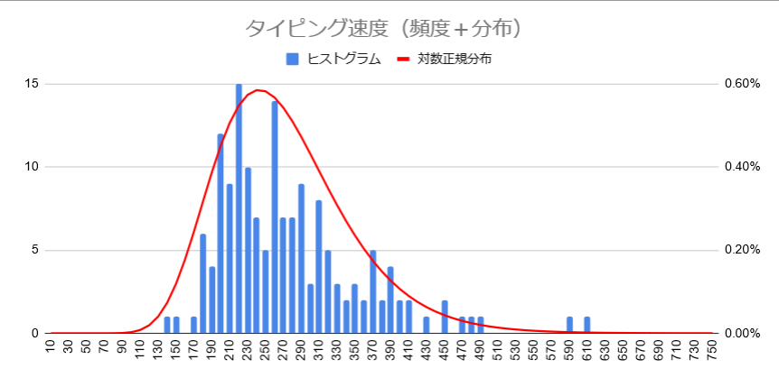 多分、全くパソコンに触れたことが無い人からタイピングの名人までを含めると、べき乗分布になるのかもしれないけど、ある程度タイピングができる方が参加すると考えると、対数正規分布になるのかな(ある程度までは成長が早く、そこからは成長が遅くなる、みたいな…ちょっと違うか…)。
