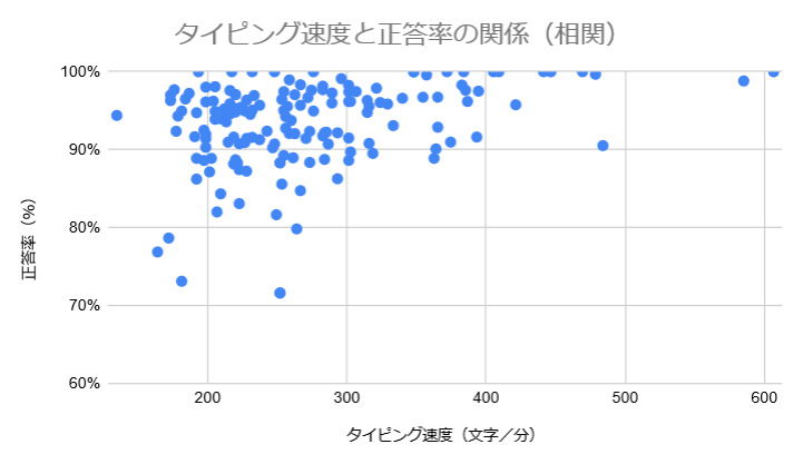 もう一つ気にしてたのが、タイピング速度と正答率の関係。