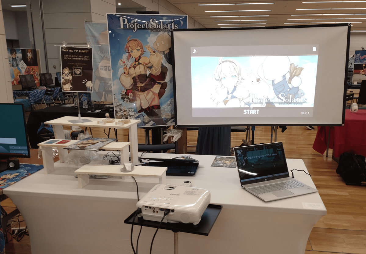 映写機、PC(1台は試遊用、1台はPV用)、ポスター(B0サイズ。ブース用+掲示用)